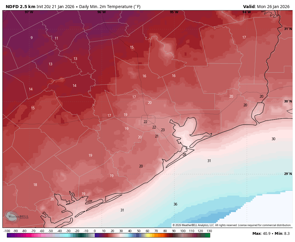 Despite the delayed onset of cold air, it unfortunately is still on the way. It now appears that Sunday, Monday, and Tuesday mornings will all bring the potential for a hard freeze. I think the coldest night will be Sunday night into Monday morning, when temperatures could drop into the upper teens in parts of Houston, and lower 20s closer to the coast. This hard freeze will necessitate care for outdoor plants, pipes, and of course pets. Please bring them inside on these extremely cold nights.