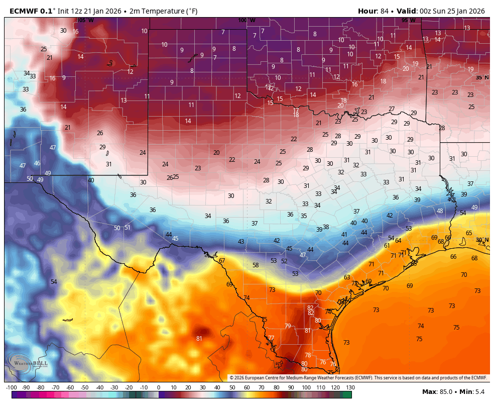 I spoke above about different scenarios. The European model, of late, has been most aggressive about delaying the onset of colder temperatures. It effectively has the rain out of here by around sunrise on Sunday, and then has high temperatures getting into the upper 30s for most of the region on Sunday afternoon. In this case I’m reasonably confident that roads would be mostly dry for the hard freeze on Sunday night. In such a world it would be extremely cold, but the roads are mostly OK to drive on for most, if not all of the weekend and early next week. (The story, of course, should be vastly different north of Houston, toward Dallas; and west, toward Austin). There is also a world in which the colder air arrives earlier, before the rain departs, and we get a few tenths of an inch of ice on Houston’s roads. Then Sunday’s highs remain near freezing, and we remain ice-bound until the middle of the day on Monday. I really don’t know what will happen, but when we know more, we certainly will share that.