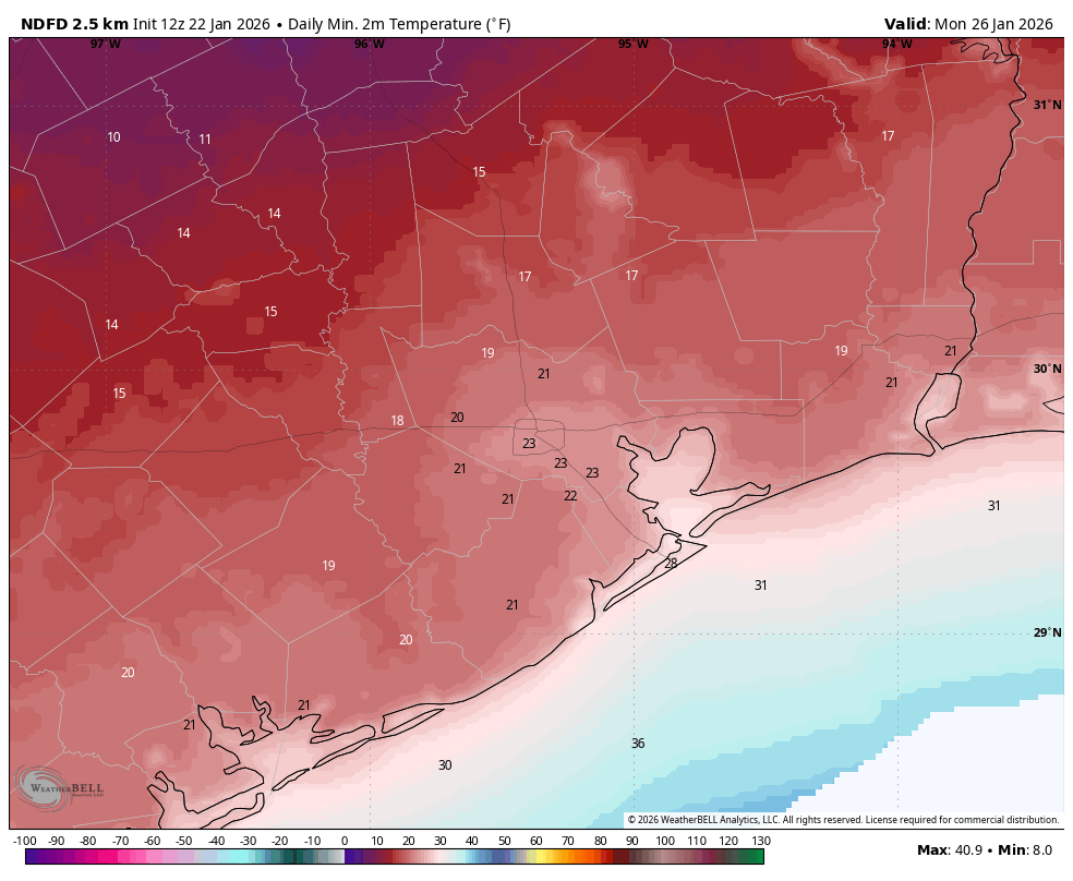 This will be the coldest period. I don’t feel particularly comfortable predicting highs on Sunday because they will be influenced by a number of factors, including clearing skies on Sunday afternoon, the influence of ice on the ground north of the Houston metro area (northerly winds chilled by this ice are not well modeled), and other factors. Generally, I think there is a decent chance that Houston’s highs reach above freezing for a couple of hours on Sunday, and if this happens in conjunction with clearing skies we could see most roads dry out. That’s the glass half full scenario. It is also possible that light rains linger into Sunday afternoon, temperatures remain at about the freezing level, and ice persists on roads through Monday morning. It’s going to be a close call in Houston. Anyway, we are highly confident in a cold night on Sunday into Monday (see image above), with lows in the hard freeze range necessitating the protection of pipes, plants, and pets. Temperatures on Monday should push at least into the upper 30s, and in conjunction with clearing skies this should end the threat of ice on roads. Lows on Monday night will be very cold again, although perhaps a couple of degrees warmer than Sunday night.