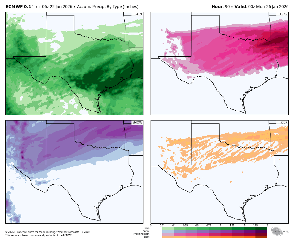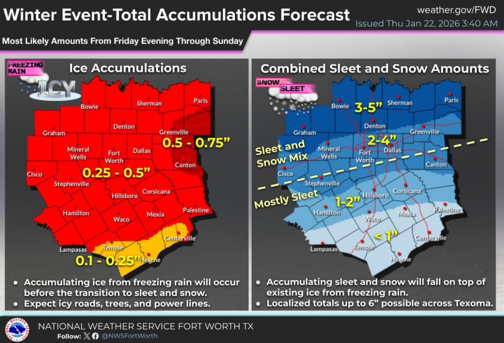 There must be a lot of cheer competitions in the Dallas area this weekend because I have received an extraordinary number of questions about participants. I wish you all well, if the competitions proceed. My sense is that travel north all the way to Dallas should be fine on Friday and Friday afternoon. At some point on Friday night, maybe sunset, maybe 9 pm, maybe midnight, rain will start to transition to sleet or freezing rain in the Dallas-Fort Worth metro area. After that temperatures will remain below freezing through at least Monday morning, and perhaps all the way to Tuesday. Roads in the region up there will likely range from hazardous to borderline impassable for the weekend.
