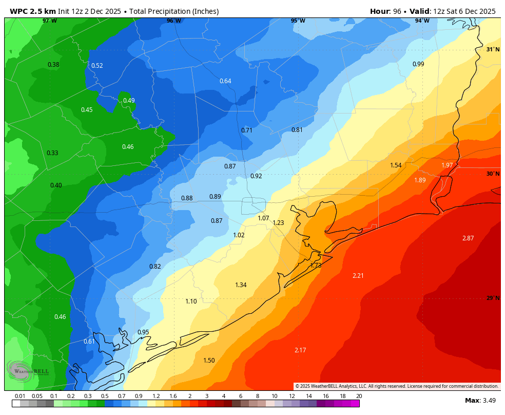 The onshore flow will be in full swing by Wednesday morning, and this is going to rapidly push temperatures to around 70 degrees, with rising humidity. We will see building clouds during the daytime, but I expect rain chances to mostly hold off until Wednesday evening or overnight. Lows drop to around 60 degrees in Houston. We will see widespread showers on Wednesday night and Thursday, as a front approaches and pushes into the region. Some of these will be moderate to heavy, and I think most of our region will pick up 0.5 to 2 inches of rain through Friday. The best chance of rain will come on Thursday, however. As the front moves in highs will top out at around 60 degrees on Thursday.