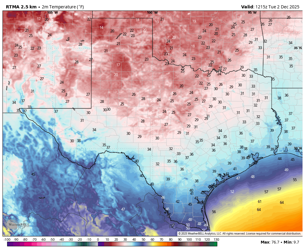 We are starting the morning out quite chilly. As expected our region has remained above freezing, with even areas well to the north of Houston such as Huntsville, Navasota, and College Station holding in the mid-30s. Most of the rest of Houston is in the upper 30s to lower 40s. We will rise into the mid-50s today, with mostly sunny skies helping to nudge temperatures upward. (This will be our last unbroken sunshine until the weekend). Winds will still be from the north, gusting up to 20 mph this morning before dying down this afternoon. We’re going to have one more cold night, with temperatures probably 1-3 degrees warmer than Monday night.