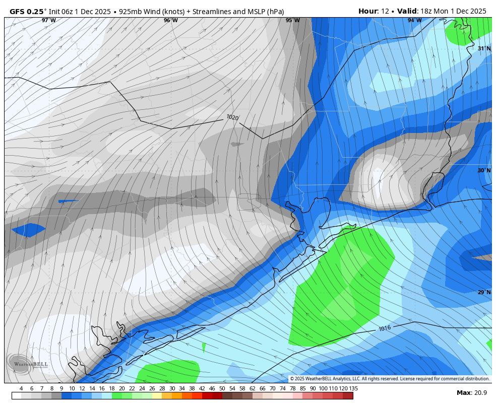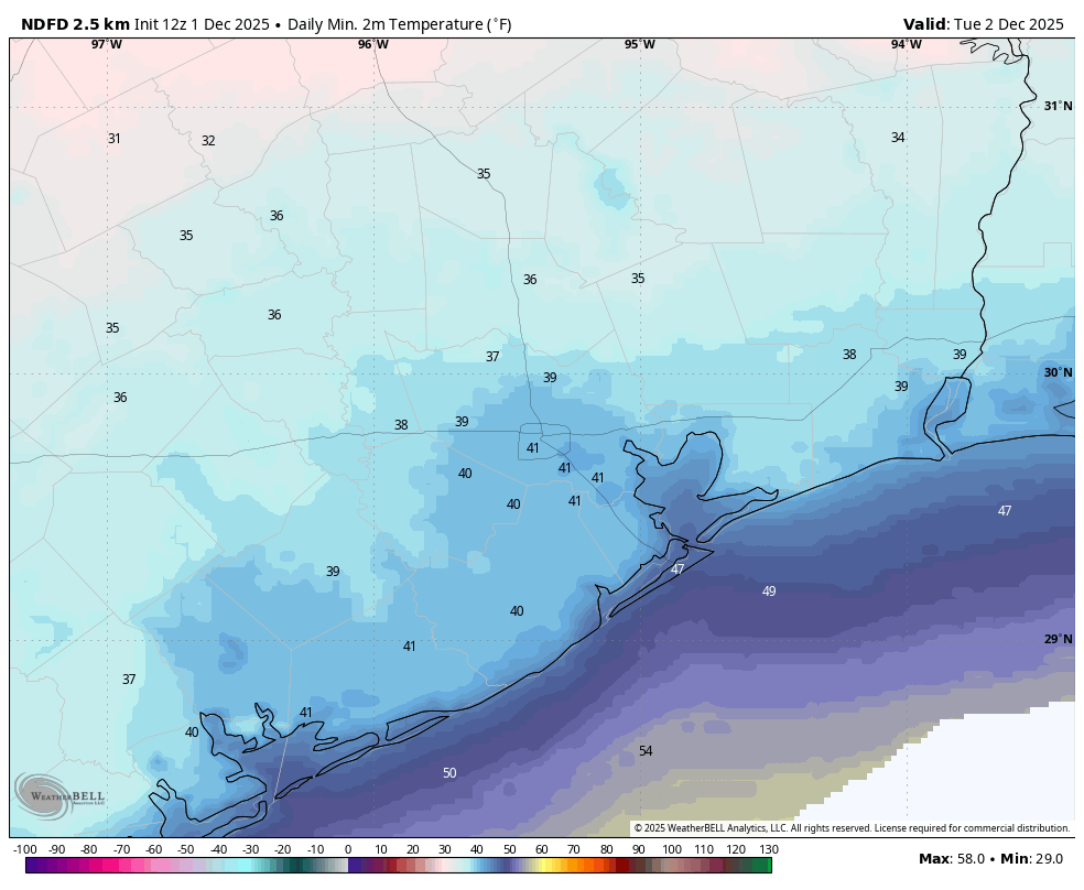 The other major story of the day is going to be the cold air. Some parts of Houston may not get out of the upper 40s today. Our low temperatures tonight will be dependent upon whether we see clearing skies by the wee hours of Tuesday. Regardless, fairly gusty winds from the north will provide less than ideal cooling conditions. As a result I think even the inland portions of our region will escape a freeze, but for some locations in northern Montgomery County it may be close.