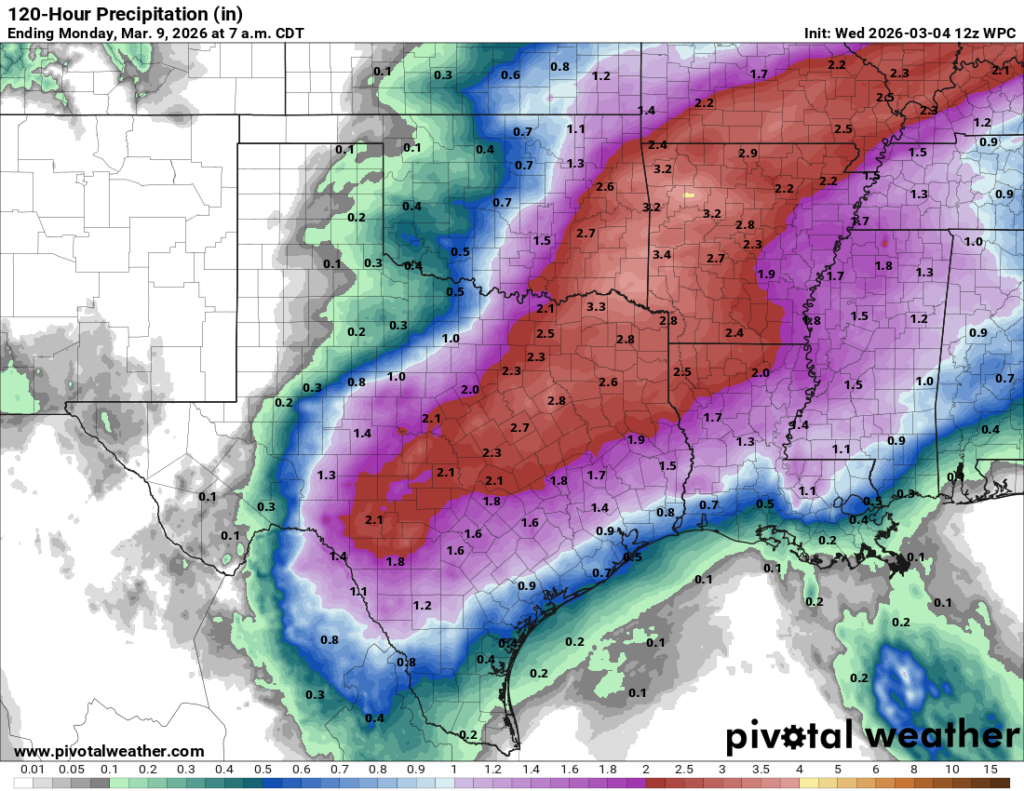 Alright, so what does the weekend hold? We are going to see a battle in the atmosphere between an approaching disturbance from the northwest (which will bring plenty of rain into central and northern Texas) against lingering high pressure to our east. There will be plenty of atmospheric moisture. It is going to come down to where the frontal boundary stalls, and for now this appears likely to happen north of the Houston area. Accordingly the greatest likelihood of rain is there as well. I continue to predict that most of our region will pick up 0.5 to 1.5 inches this weekend, but I’m more confident of that occurring inland of Highway 59/I-69 than I am for coastal areas, further away from the stalled boundary. Temperatures this weekend should remain warm, in the low 80s, with plenty of clouds and humidity.