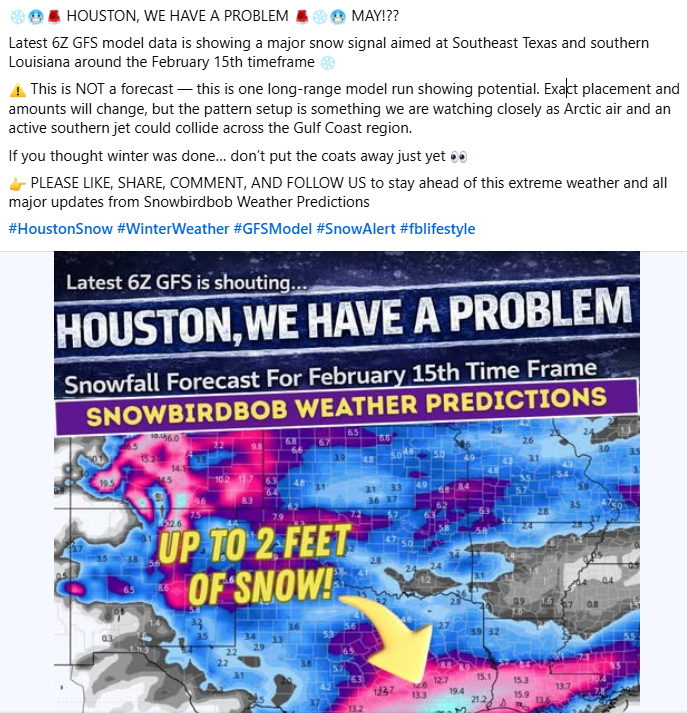 Matt and I began to receive some messages on Saturday morning about the potential for the greater Houston region to receive another Arctic blast around Valentine’s Day. The questions kept coming on Sunday, along the lines of, “rumors are circulating …” about the threat of a major snowfall in the region. We were scratching our heads because there were no valid indications of such an occurrence.