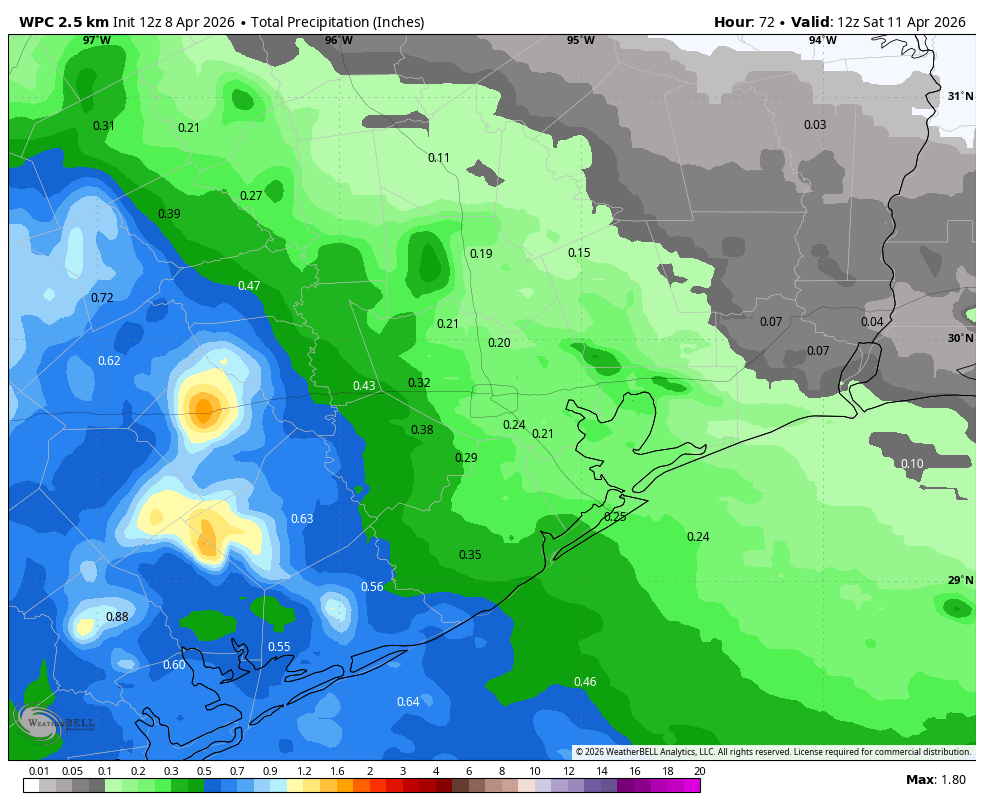 This day will bring our best chance of rain for the week as an upper-level disturbance moves into the area and combines with a fairly moist atmosphere. The best chance of rain is likely to be southwest of Houston, so places like Fort Bend and southern Brazoria counties. However, I expect most of the area to see a healthy chance of rain, with much of us probably picking up between 0.25 to 0.75 inch of rain through Friday night. Highs will be near 80 degrees with another muggy night.