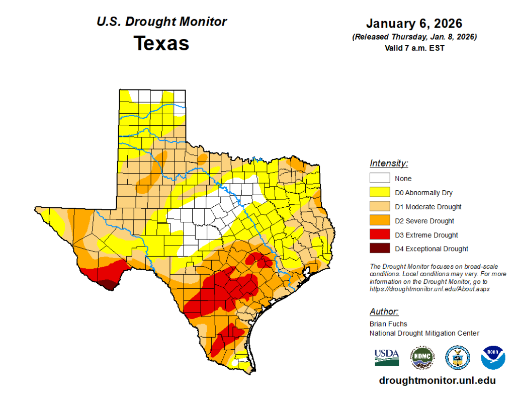 Some parts of the Houston area (i.e. Kingwood, Cypress, Spring, Oak Forest, and other nearby environs) picked up a decent amount of rain with last weekend’s cold front, but for the majority of the region totals were far less. For some areas on the south side of Houston, it has been more than six weeks since a solid rainfall. And according to the most recently issued US Drought Monitor, a large slug of the southern half of the metro area has now fallen into a ‘severe’ drought.