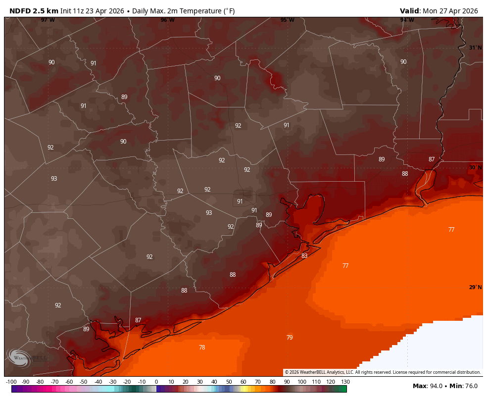 Yes, a few spots in Houston have already hit that mark this year, but officially the region’s hottest day came on March 21 when the high temperature at Bush Intercontinental Airport reached 88 degrees. So far, our average high temperature this month has been below 80 degrees. The bottom line is that, after today, Houston is going to experience is longest, and hottest period so far of the year, as well as a foretaste of what is to come next month and beyond as summer slides into the region.