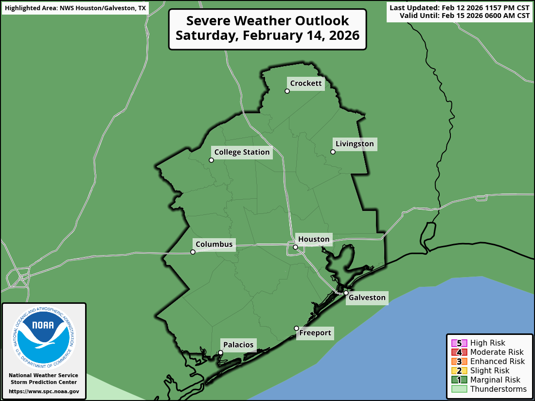 The entire region is carpeted in a marginal risk, level 1/5, for severe weather tomorrow, which generally means lower-end coverage of severe storms. Many locations will hear thunder, but only one or two may see a severe storm with gusty winds. Storms should exit the coast around or before midnight, ending any severe threat, The chance of a severe storm may be highest north of I-10 tomorrow.