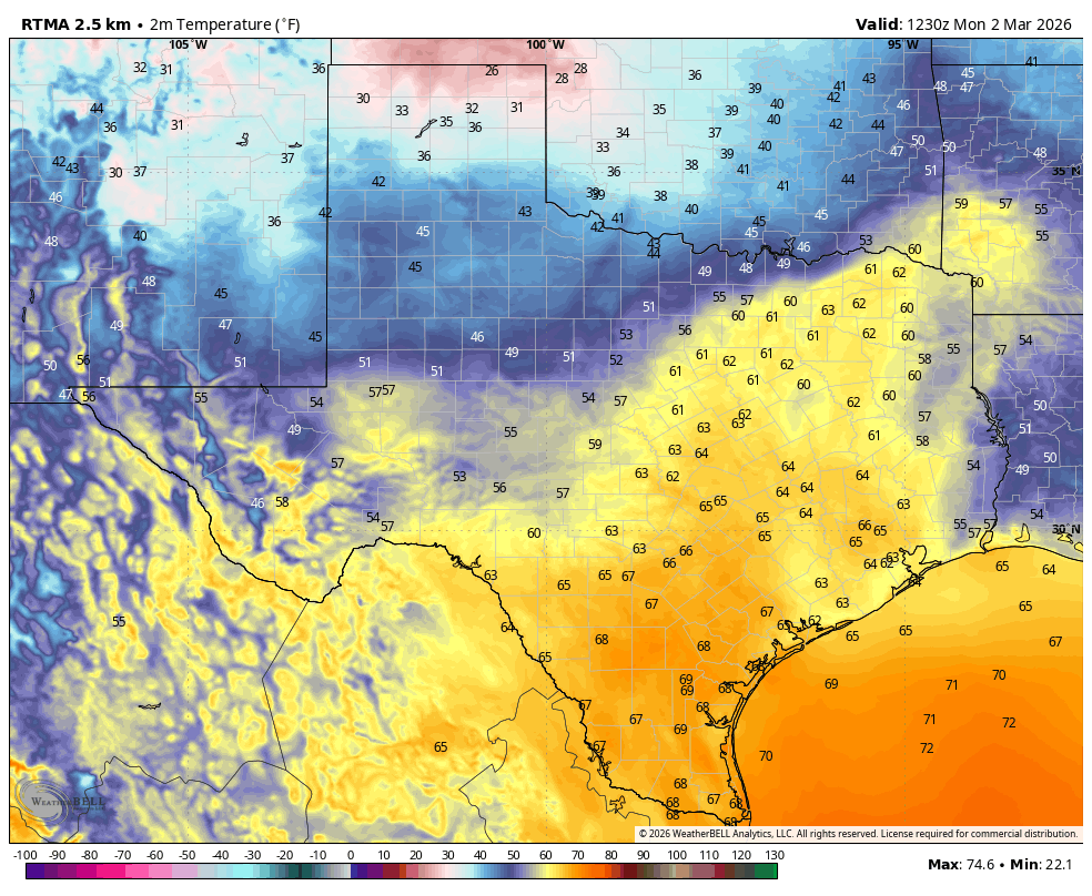 Conditions are fairly warm for early March out there, with temperatures in the low- to mid-60s this morning, and we are going to see warm-ish weather all week as a southerly flow dominates our weather. High temperatures today will reach the lower 80s, with mostly sunny skies and modest winds from the southeast.