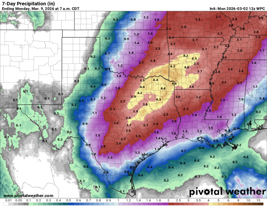 The weekend looks rainy for much of the state of Texas as a series of disturbances push through. We still don’t have high confidence in rain accumulations for the Houston area, but there is the potential for 1 to 3 inches from Saturday through Monday, with higher isolated amounts. Rain totals area likely to be even greater for central and northern Texas, where locations could see 3 to 5 inches, and there is the potential for some flooding. (Matt will have more on the broader Texas implications on The Eyewall later this morning). Anyway, for Houston, I don’t expect wall to wall rain, but rather we should see cloudy skies this weekend with muggy temperatures and on-and-off showers. If you have outdoor plans we’ll be able to better refine the forecast the closer we get.
