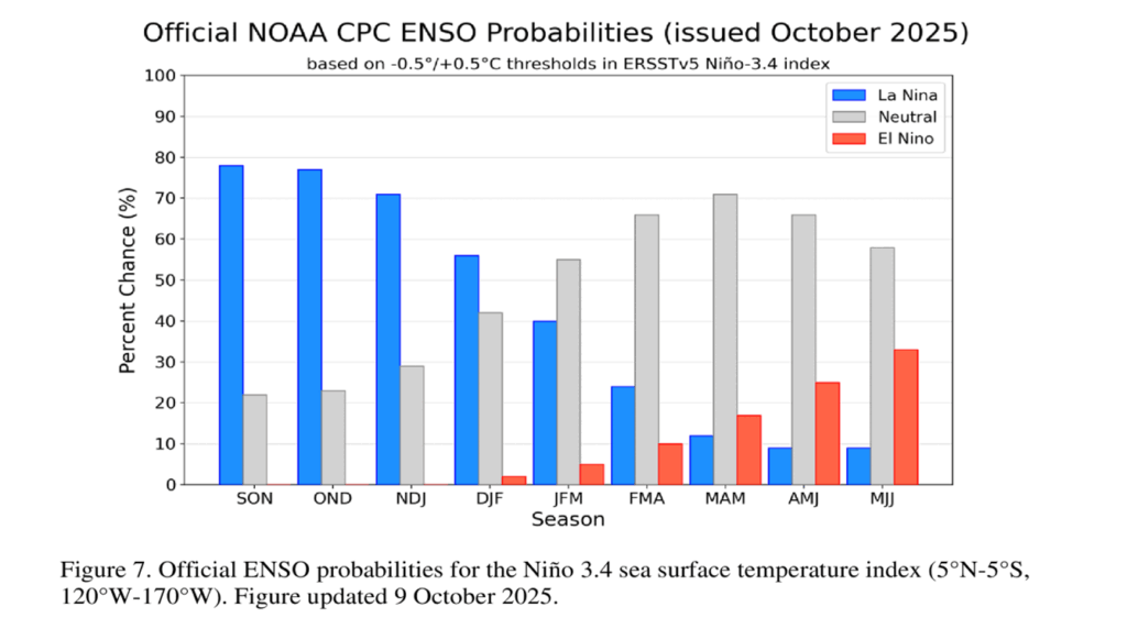 A. So yes, La Niña conditions are currently present in the equatorial Pacific Ocean. This means that sea surface temperatures in the region are mostly below average across the area. According to the latest forecast from NOAA, issued last week, La Niña conditions are likely to persist through winter, with a transition to ENSO-neutral conditions likely in during the January to March time frame next year. Predicting precisely when just is not possible.