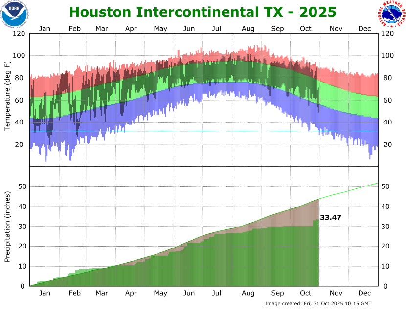 Another good resource is the climate page of the Houston/Galveston office of the National Weather Service. They have lots of good resources, but among my favorite are snapshots of annual rainfall totals compared to normal levels. From this it is pretty clear that the Houston region has been building up a rainfall deficit since early August. That is pretty consistent with the time I started watering my grass this year.