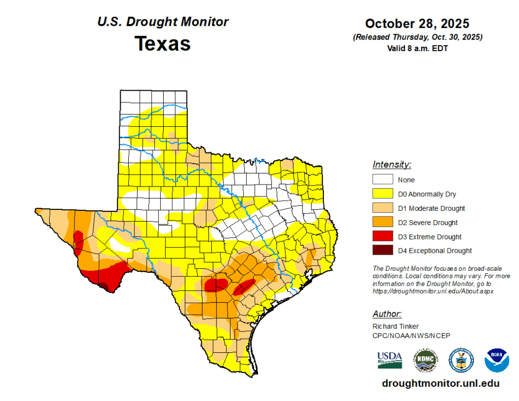 A. Generally, Matt and I rely on the U.S. Drought Monitor to determine drought conditions locally and nationally. They characterize the intensity of drought from “none” to “exceptional drought.” As of this week (with data through Monday, October 27) a little more than half of the Houston area is “abnormally dry” and a little less than half is in a “moderate drought.” If you’re interested in the methodology behind the drought determination, more information can be found here.