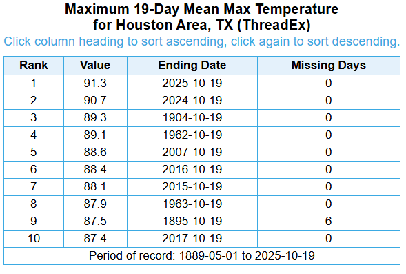 The normal high during the first three weeks of this month is about 85 degrees. This month’s temperature, through 19 days, is the hottest ever, beating the record of 90.7 degrees (set last year). Compare this to the ‘normal’ high temperature for September, which is 90.4 degrees. So yes, if you’re thinking that large swathes of October have felt like a continuation of summer-like weather, you’re not wrong. If you’re wondering if fall is ever going to arrive, the answer is yes, hopefully a little more than one week from day. More on that below.