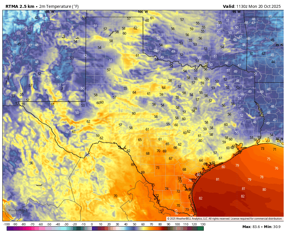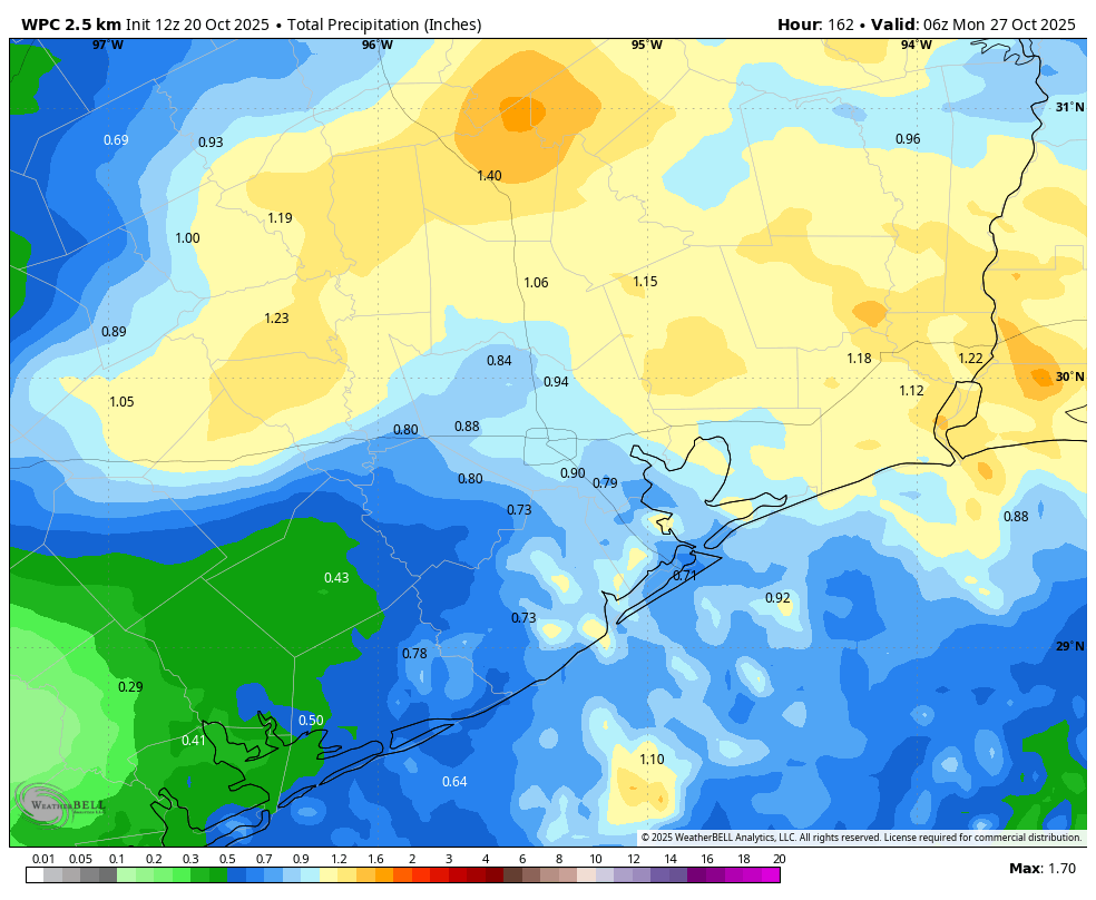These should be a pair of partly sunny days with highs in the 80s. Wednesday will have lower humidity, but Thursday also does not look excessively humid. Wednesday night should see lows drop into the mid-60s (colder still north and east of Houston), whereas Thursday night only falls to around 70 degrees. Rain chances on both days is near zero.