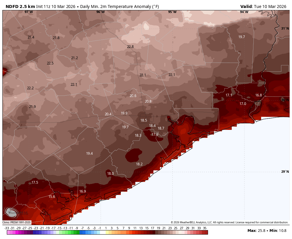 In brief: In today’s post we discuss the very, very warm temperatures across the Houston region this morning and put them into context. We also look ahead to the potential for some storms with a front on Wednesday, with cooler and drier air to follow.