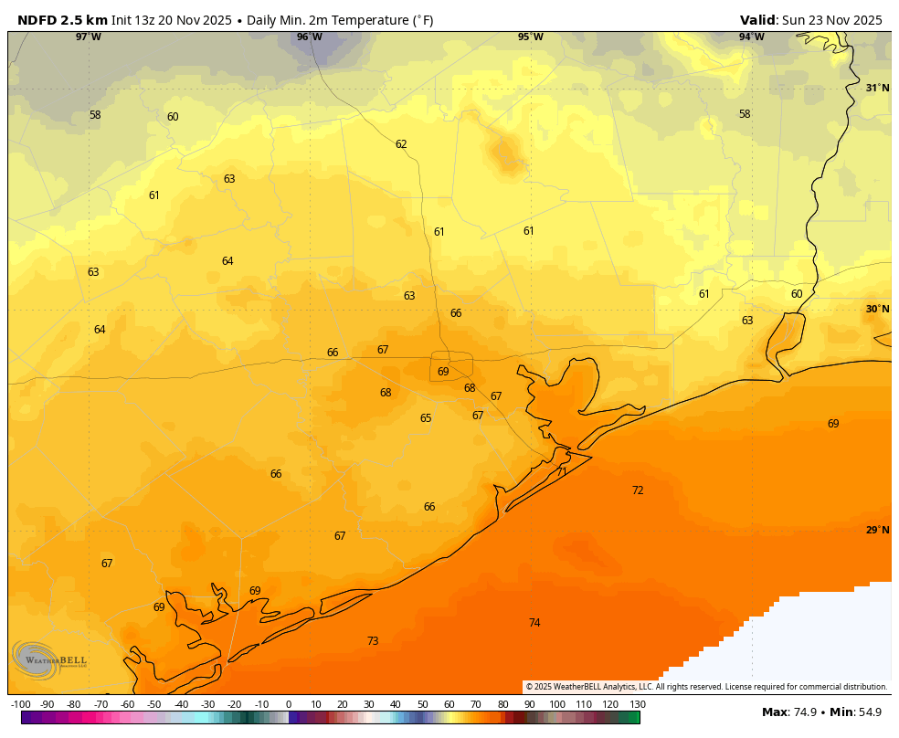 The ‘front’ should lift back north on Sunday only to be followed by a second front that looks to be stronger. This will bring a healthy chance of rain on Monday and Monday night. By Tuesday or Wednesday we should see an influx of cooler and drier air. My prediction for Thanksgiving Day remains for morning temperatures in the lower 50s, with highs in the upper 60s. Skies should be mostly sunny. Lows will bottom out on Friday and Saturday, probably. Anyway, it should feel more like late November in Houston, finally. Precise details to come.