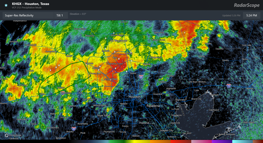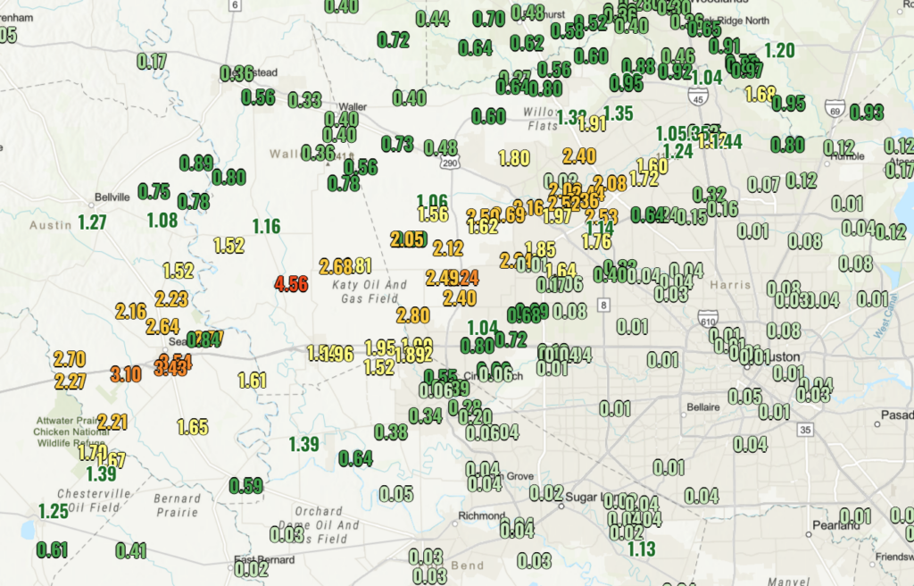 So far today, some areas west of Houston have seen nearly 5 inches of rain, with a Harris County Flood Control gauge north of Pattison registering over 4.5 inches so far. If you’re traveling north or west of Downtown, just be advised there may be street flooding in spots.