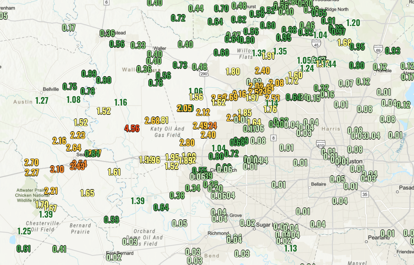So far today, some areas west of Houston have seen nearly 5 inches of rain, with a Harris County Flood Control gauge north of Pattison registering over 4.5 inches so far. If you’re traveling north or west of Downtown, just be advised there may be street flooding in spots.