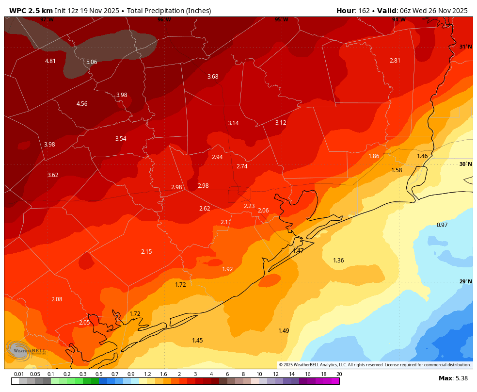 This will be another mostly cloudy, humid day, likely with highs in the low 80s. The real question for the forecast is the extent of showers and thunderstorms. We’ll have plenty of atmospheric moisture, but it remains to be seen how far the front pushes into Houston, and how much is perturbs the atmosphere. For now I think we have about a 50 percent chance of showers. Note that the rain accumulation map shown below is for totals through next Tuesday, so don’t expect this much on Friday. Most of us probably will pick up 0.25 to 0.75 inch through Friday.