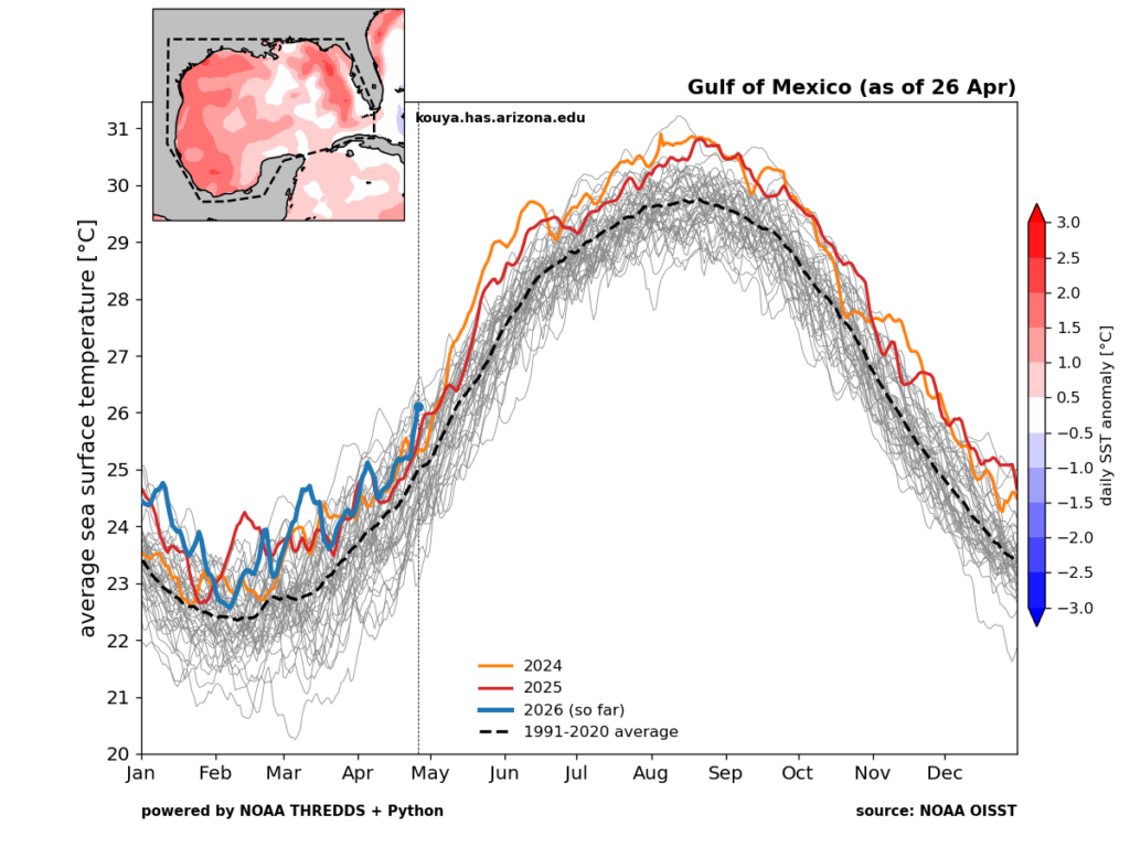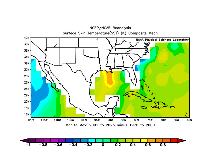 In the above chart from the University of Arizona, the blue line is in the middle of the pack for above normal water temperatures, but you can see that 2024 and 2025 were setting numerous daily records too. What we’ve sort of seen with the Gulf is a minor warming in the summer in the last 20 to 30 years but a more substantial warming in the fall, winter, and (as shown below) spring. Essentially what seems to be happening is that as our winters, springs, and autumns have warmed, the Gulf has not cooled off as much as we used to see historically.