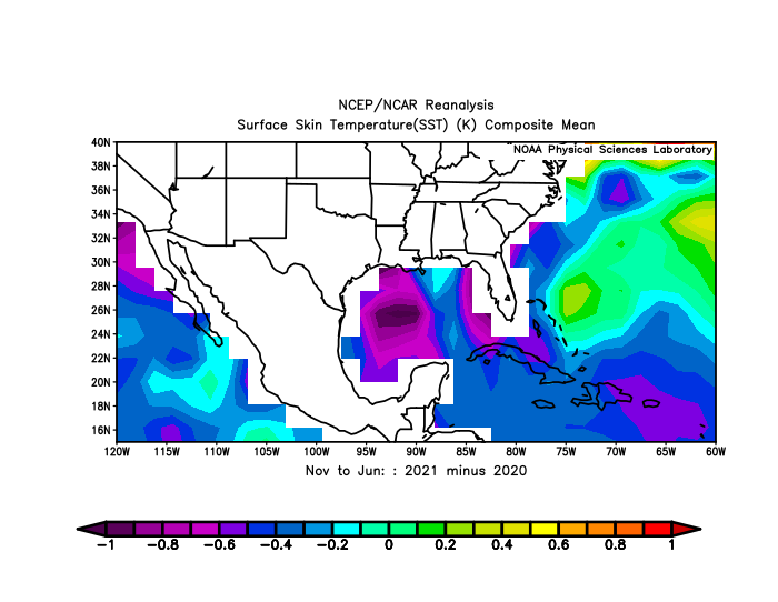It pains me to type this, but what would cool down the Gulf of Mexico? The only two logical things that could do it are time or a very large and intense hurricane traversing the middle of the Gulf. Let’s take a look at the most potent Gulf hurricane season in recent memory: 2020. We’ll subtract the November through June sea surface temperatures from the following period (November 2020 through June 2021) just as an example. You’d expect the Gulf to be notably cooler. And it is quite a bit cooler.