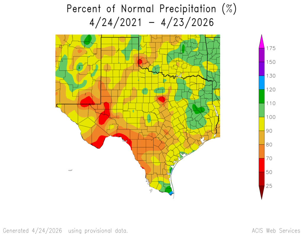 To put a little data to this question, let’s take a look at “percent of normal” rainfall totals for the state of Texas over the last five years. Basically, we can see, for areas from The Woodlands to Galveston pretty much everyone has received 80 to 100 percent of normal rainfall levels. If you squint the Fort Bend County has done a little worse than most.