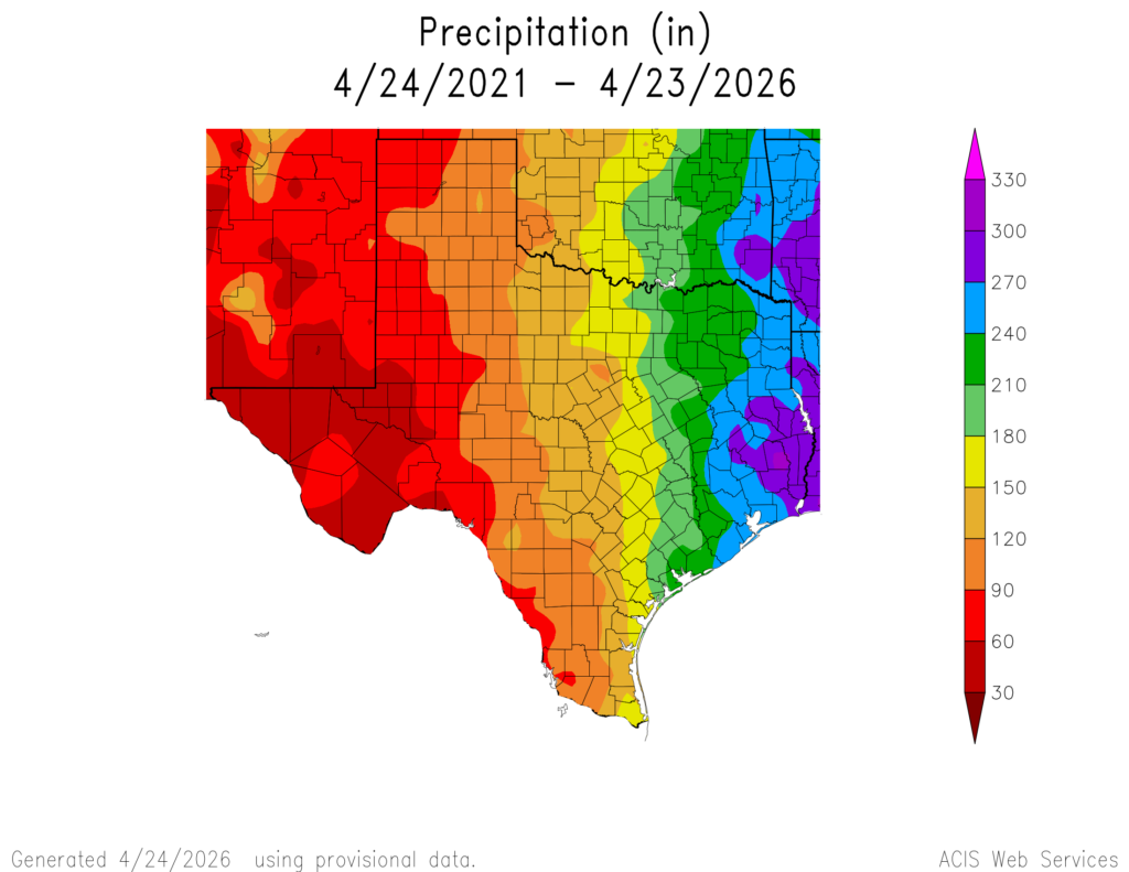 Finally, let’s look at raw rainfall totals over the last five years (below). We can see that the real gradient in rainfall amounts is more of an east-to-west one rather than a north-to-south one. What this reveals is that areas west of Houston, including Fort Bend County, are climatologically a little bit drier than areas to the south and east of the city. This is primarily due to Gulf proximity. Anyway the bottom line is that all of this is mostly psychological.