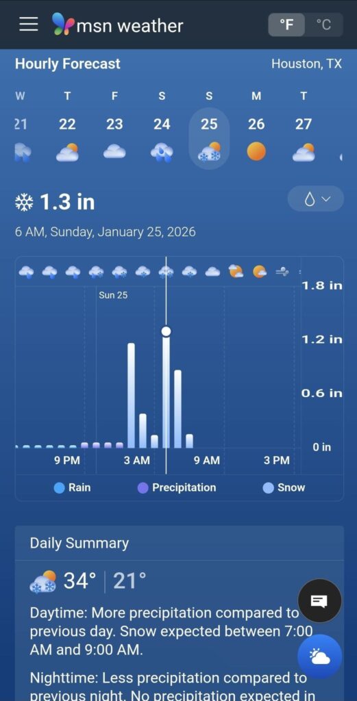 A. I don’t know. It’s difficult for me to see snow falling much south of Dallas and Fort Worth, and certainly not in Houston. There are a lot of great weather apps out there, but at the end of the day it helps to have a human in the loop to ground truth all this data.