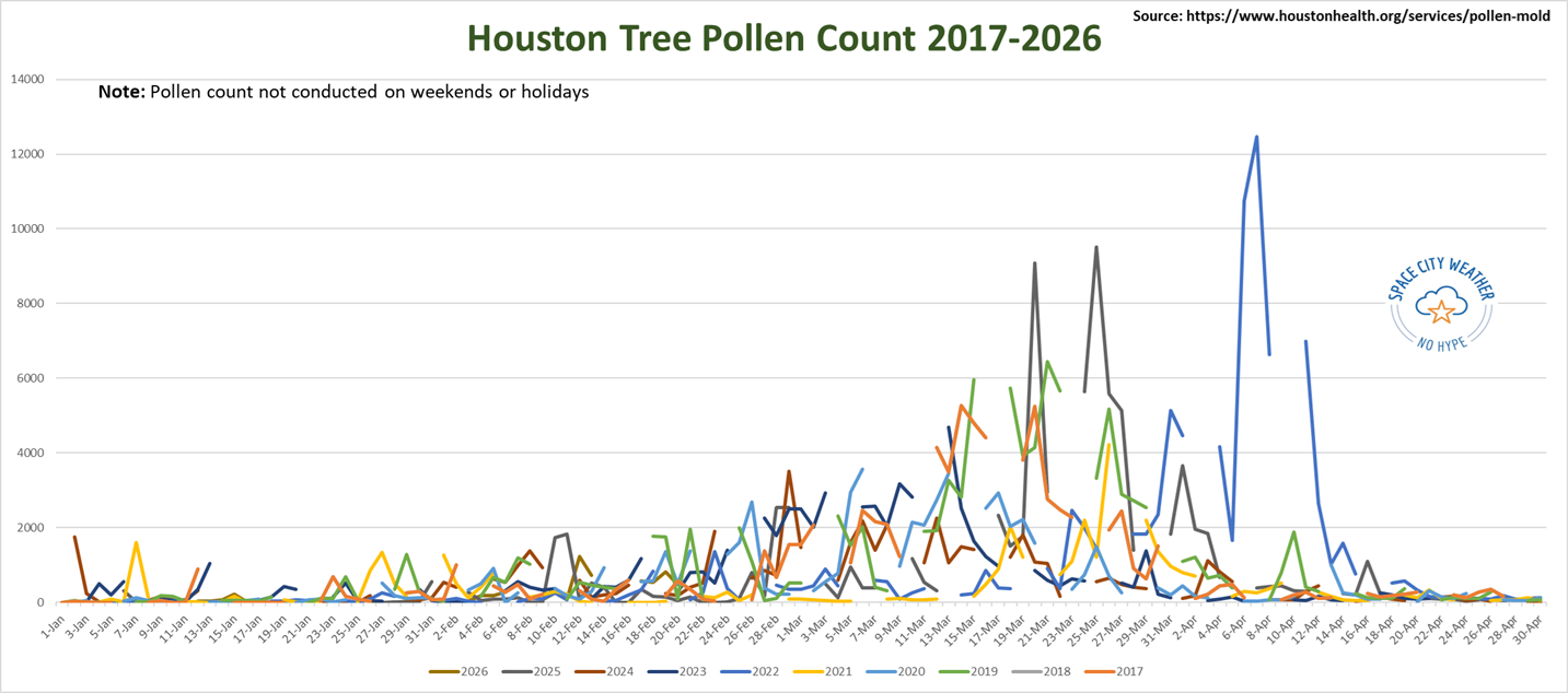 A. This question tends to come up each spring, or late winter as it is in Houston. Is allergy season starting earlier than it has? There’s some evidence in research that says this is occurring as the climate warms. But looking practically at recent data specifically in Houston, it’s a little more mixed. Tree pollen is considered high once levels hit about 80 or so. But the first really, really bad day of spring typically hits when we get to around a level of 500. If you’re curious, the worst day we’ve had since we’ve tracked this back to 2017 was April 7, 2022 when pollen levels exceeded 12,000!