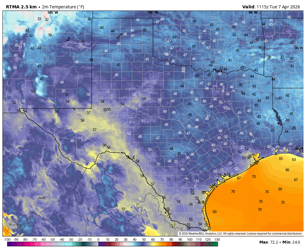 We are starting today with chilly conditions, with low- to mid-50s in Houston and cooler temperatures further inland, but we are going to warm up nicely this afternoon. Highs will vary from the mid- to upper-70s with mostly sunny skies. Winds today will be from the northeast, at 5 to 10 mph, and gradually shift throughout the day to come from the southeast. Low temperatures tonight will fall to around 60 degrees in Houston, with slightly cooler conditions further inland, and a bit warmer closer to the coast.