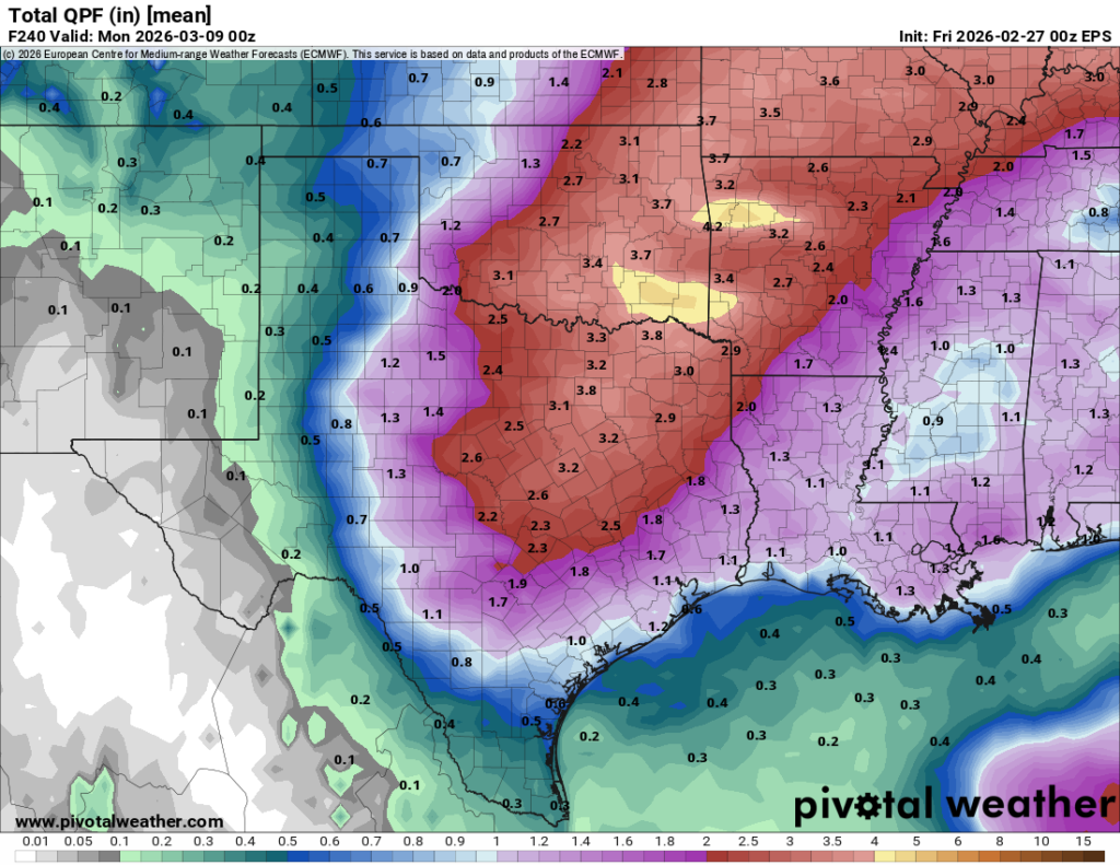 I do think the heavier rain risk is probably in that northeast Texas belt from roughly Waco through Texarkana right now, but either way, we should get at least one or two periods of rain and thunderstorms beginning later next week and into the weekend in our area too. Whether it’s enough to truly dent the drought, we shall see.