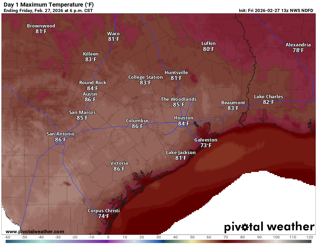 Houston failed to hit record highs Thursday, but as Eric noted in the morning, despite the clouds, we still managed another 80-degree day, with 83 for a high yesterday. That was our 14th 80 degree day of meteorological winter, which puts us in 5th place all time for most wintertime 80s behind 2021, 2025, 2017, and 1911. We tied with 2012. We will probably finish with 16 total this winter, putting us in a tie with 1911 for 4th place. More 80s to come.