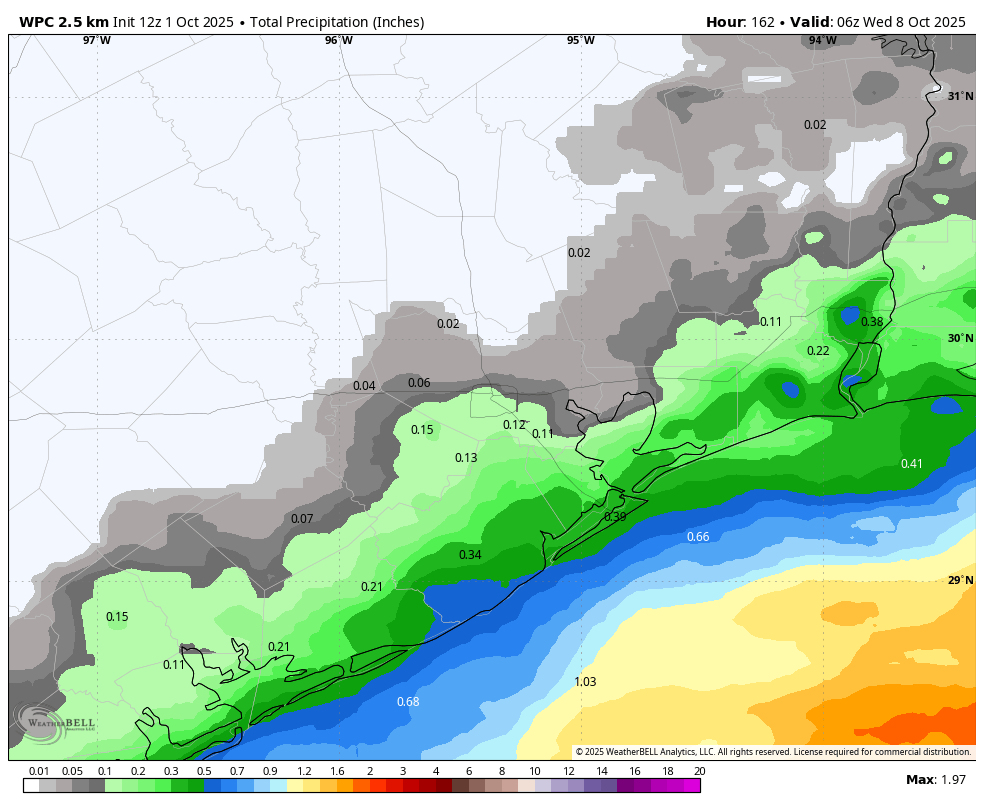 By October, well, that is when we can have some expectation of starting to see real cold fronts that knock nighttime temperatures into the 50s. Some days in the 80s with dry air. Alas, here we are on October 1, 2025. And there is no sign of such a front. In fact, the first 10 days of the month look very much like September. So maybe go back to sleep for awhile longer, everyone.