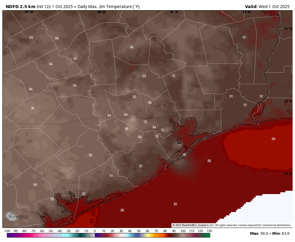 These will be fairly hot and sunny days, especially for October. We are unlikely to set high temperature records, but the city will flirt with them. In central and southern areas, highs should reach the lower 90s, but for inland areas north and west of downtown, highs could reach the mid-90s. This is partly because afternoon dewpoints should fall to around 60 degrees. So it will be a slightly drier heat, as we’ve seen the last couple of days. Winds will be light, from the north at about 5 mph. Lows will be in the lower 70s. Rain chances are basically zero.