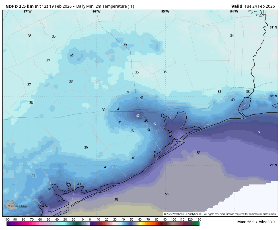Winter’s back! These will be cooler days with highs probably in the 60 to 65 degree range along with sunny skies. Sunday will be breezy, but I expect winds to settle down by Sunday evening. Sunday and Monday nights will definitely be on the chilly side. I expect lows of around 40 degrees in Houston, with slightly cooler conditions for inland areas. However I expect the region to remain above freezing, if only a few degrees in the cold spots such as Conroe.