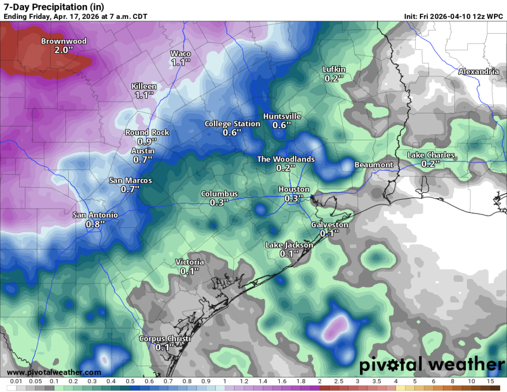 In brief: Daily rain chances will remain for Houston over the next several days, but admittedly on most of those days it seems unlikely we’ll cash in. While there will be a couple opportunities for legitimate rain chances over the next 6 to 7 days, Central and West Texas may end up in a much better spot than Houston for now.