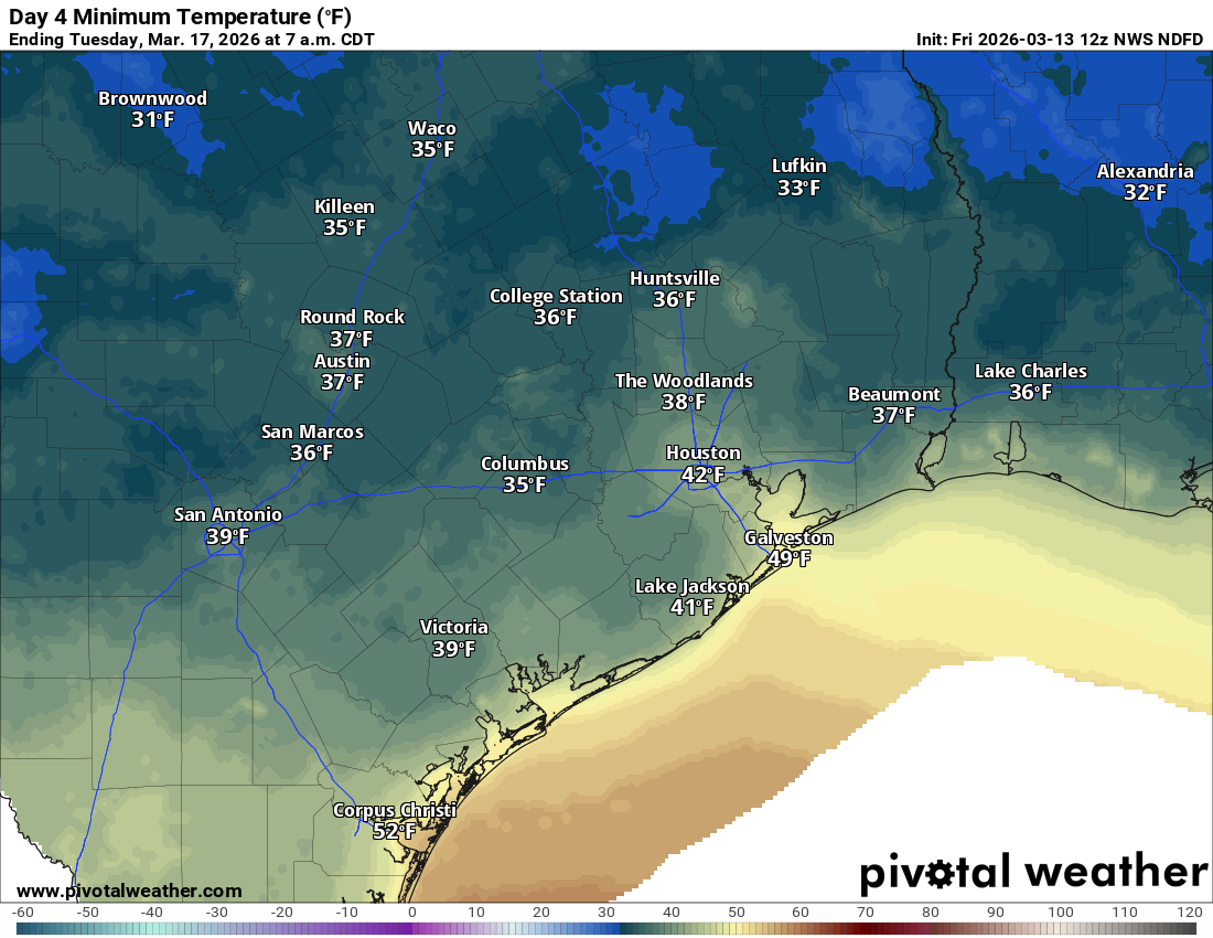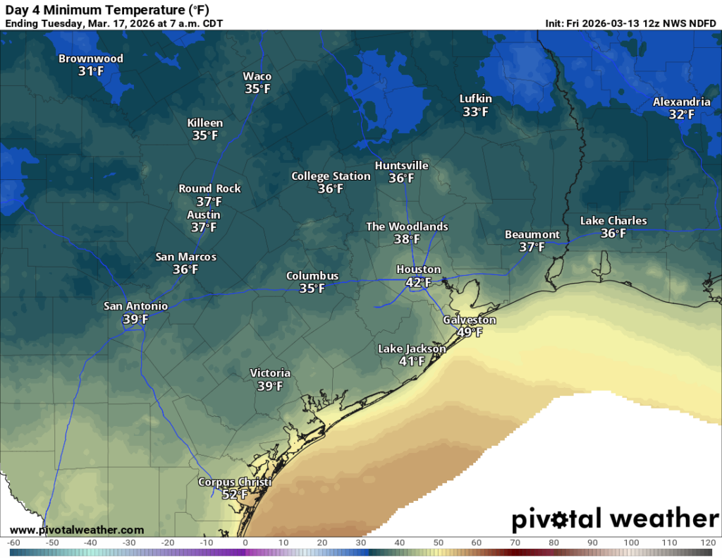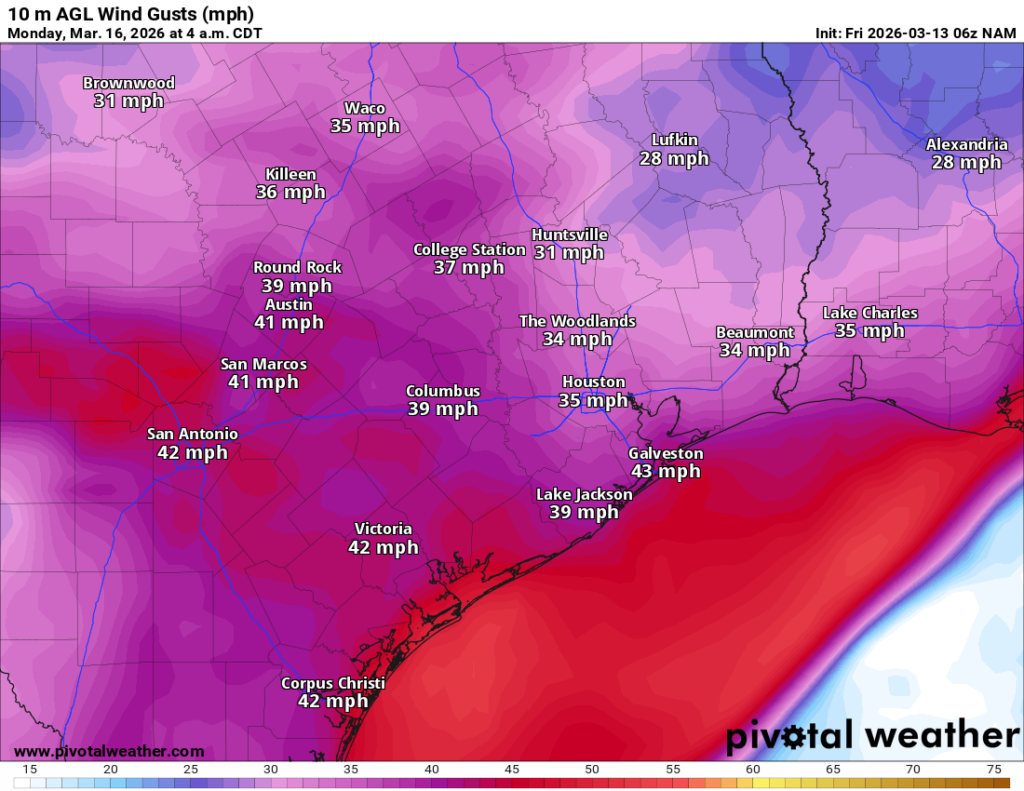 Here’s where the forecast gets a little wild. The cold front hits the area in the evening hours Sunday, after highs in the mid-80s. It will probably carry a broken line of thunderstorms. We don’t currently expect any severe weather from this, but it’s possible some strong storms occur, especially in northeast Harris or Liberty County. The area is in a marginal risk (level 1/5) for severe storms. But the front is going to arrive with some oomph. As winds flip around to come out of the north, they could gust over 40 mph for a few hours Sunday evening. Temperatures will also drop about 30 to 40 degrees from highs in the 80s to lows in the 40s.