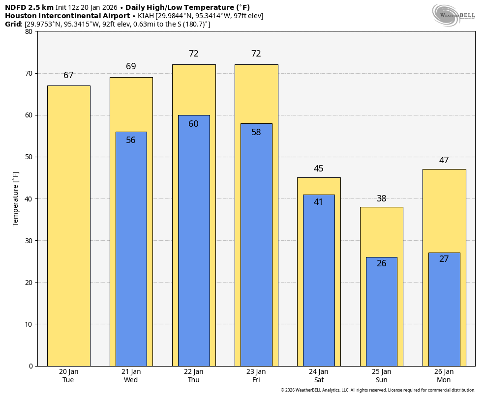 The bottom line is that there is the potential for slick streets north of Houston on Friday night, and in the city itself beginning Saturday afternoon or evening. We will be watching this closely, of course, as the difference between rain and freezing rain is but a degree or two. Lows on Saturday night will probably drop into the mid- to upper-20s in Houston on Saturday night, but there remains a large dollop of uncertainty there.