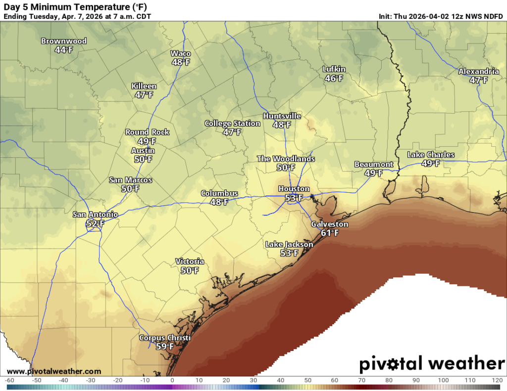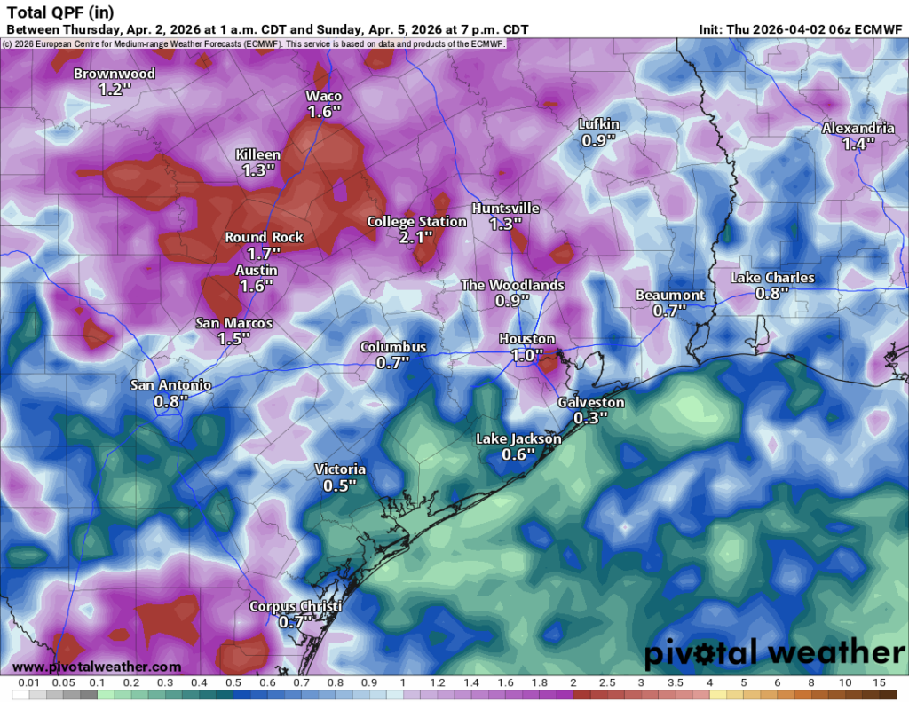As of right now I would expect the best chances of a half inch or more of rainfall on Saturday to be north of I-10 and west of I-45, with the lowest chances south of I-10 and west of Highway 288. Rain totals may end up ranging from a quarter inch in the Wharton area to a half inch or so at the coast to 1.5 or 2 inches northwest of Houston. We’ll fine tune this again tomorrow.